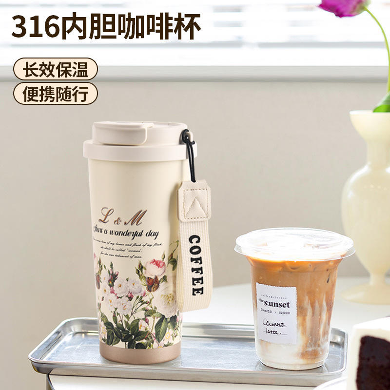 L&M Floral Insulated Tumbler 16Oz Stainless Steel Coffee Travel Mug With Lid And Strap