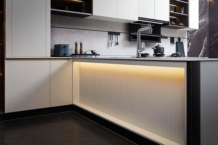 L-Shape Brown Gold Lacquer Metal Texture Contemporary Style Kitchen Cabinets With Wine Cabinets