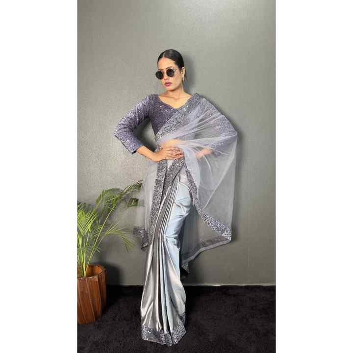 LATEST SOFT SATIN and NET SEQUENCE BOREDR WORK SAREE WITH STITCHED BLOUSE GREY