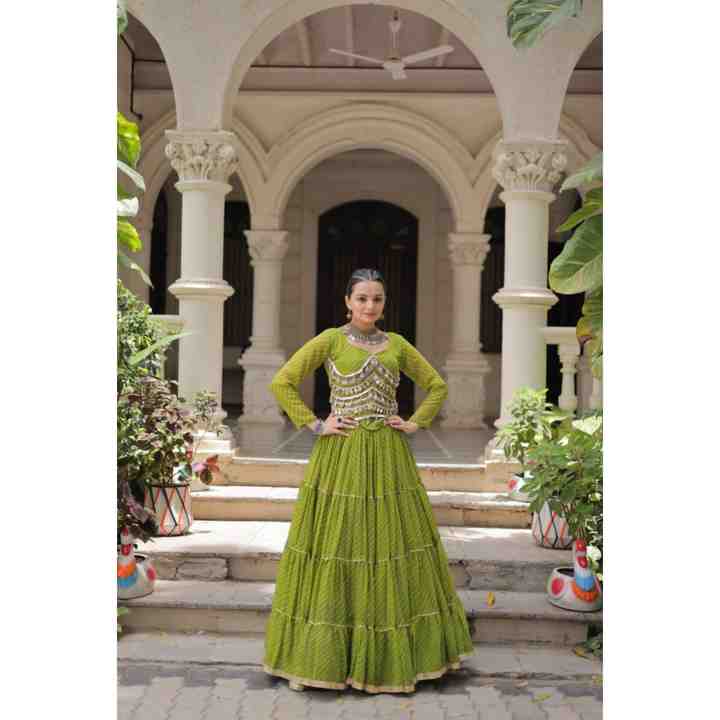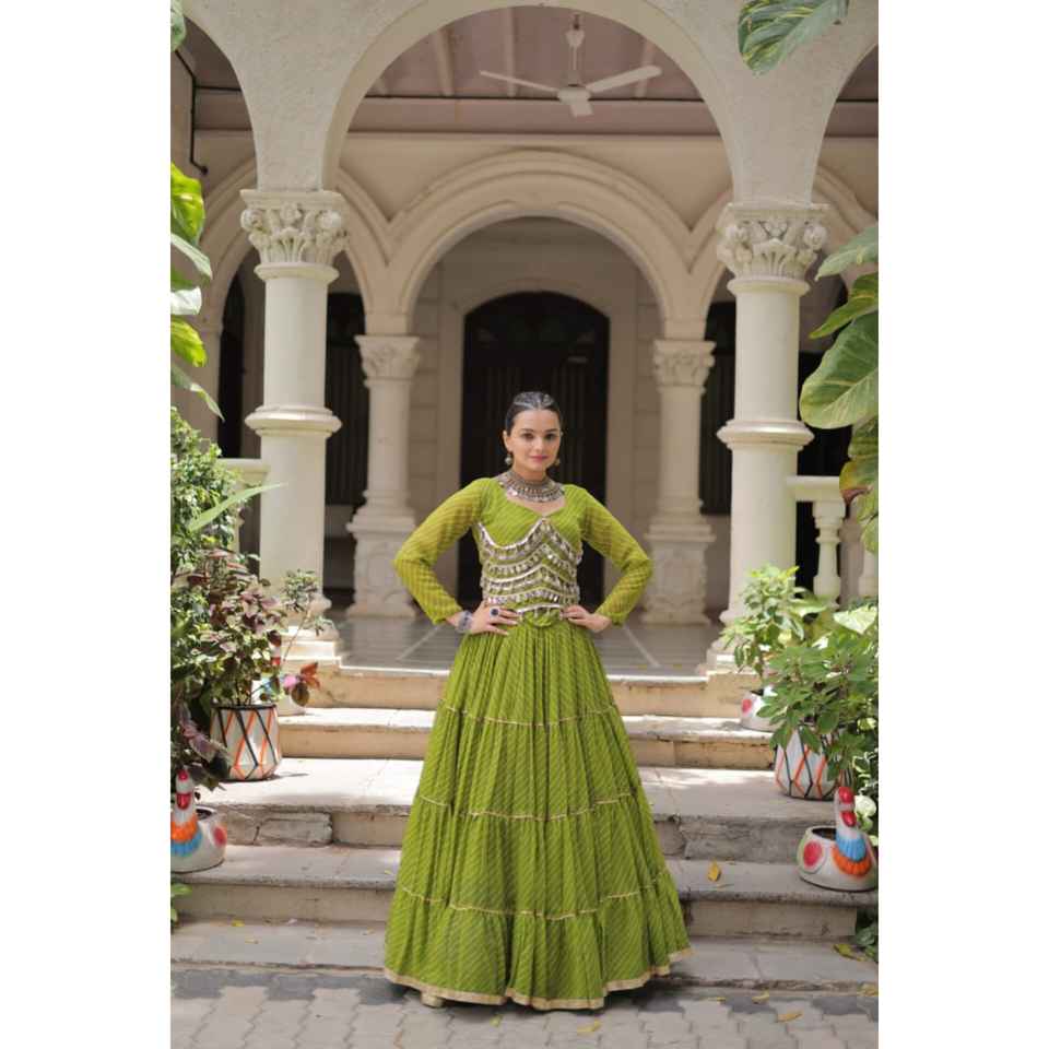 LAUNCHING FESTIVE MODERN PARTY WEAR LEHENGA CHOLI FABRIC LEHERIYA PRINT WORK with ATTRACTIVE GOTA PATTI LACE