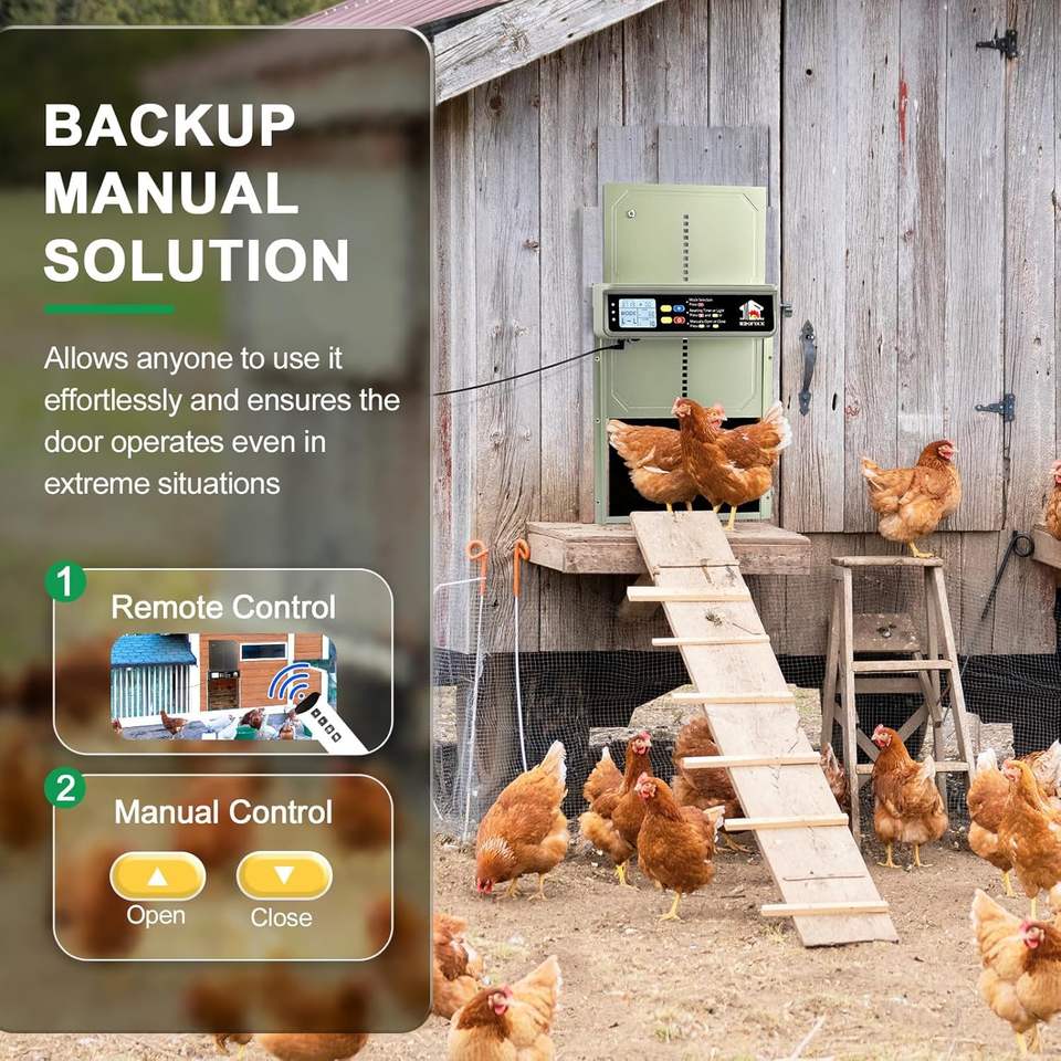 LCD Display Chicken Coop Door Automatic Solar Powered 4 Auto Modes Light Sensor Timer Anti Pinch Safety USB Backup Power