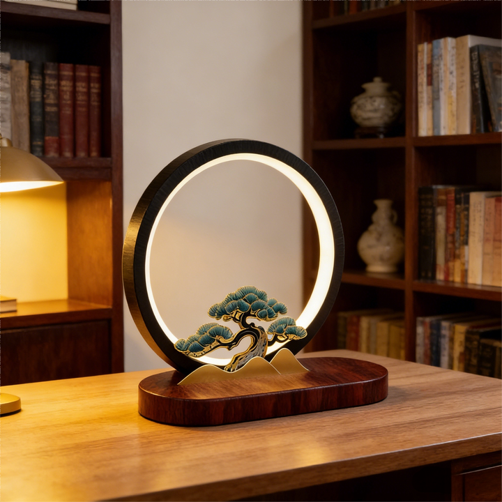 LED Aluminum & Metal Chinese Style Circular Pine Ornament Desk Lamp with Wireless Charger and Customizable Logo