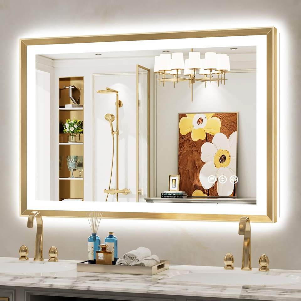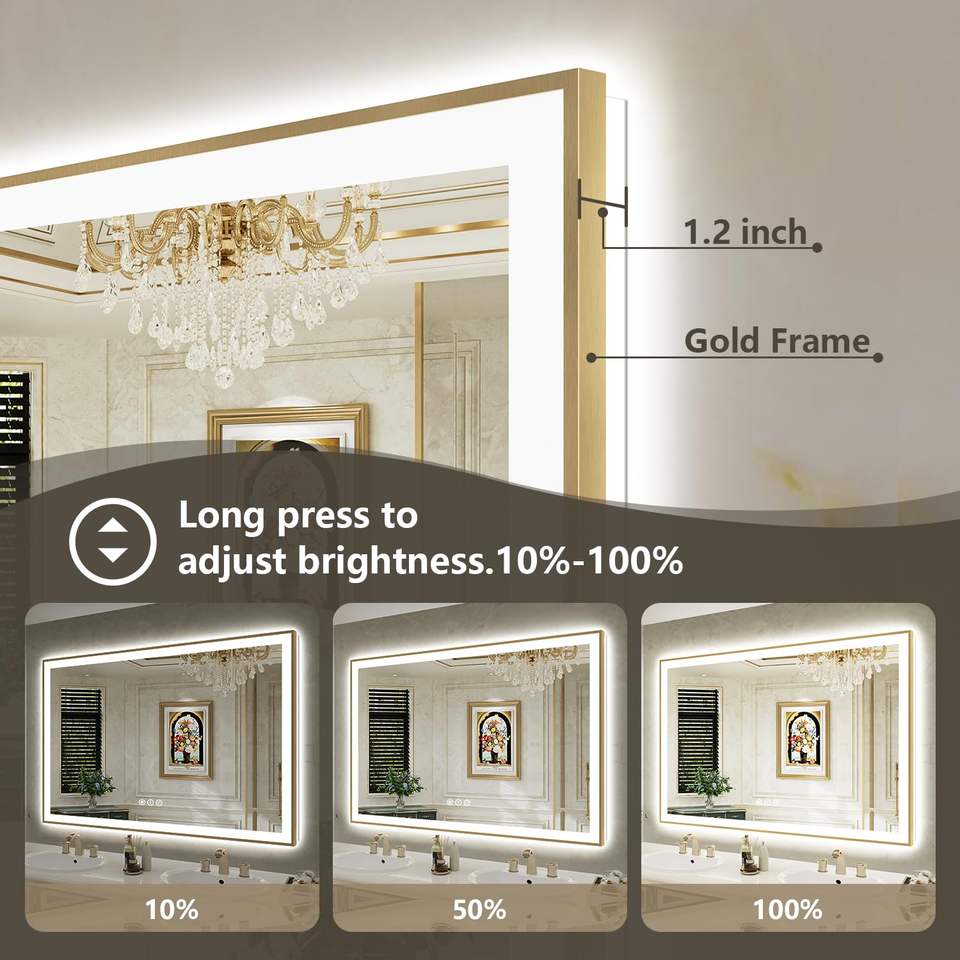 LED Bathroom Vanity Mirror Gold Frame Dimmable Anti-Fog Memory Tempered Glass Frontlight Backlight Illuminated Wall