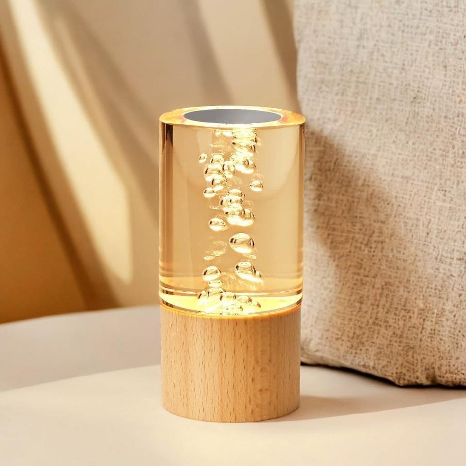 LED Bubble Night Light Acrylic Crystal Night Light with Wooden Base Brightness Adjustable Reading Room and Bedroom Table Lamp
