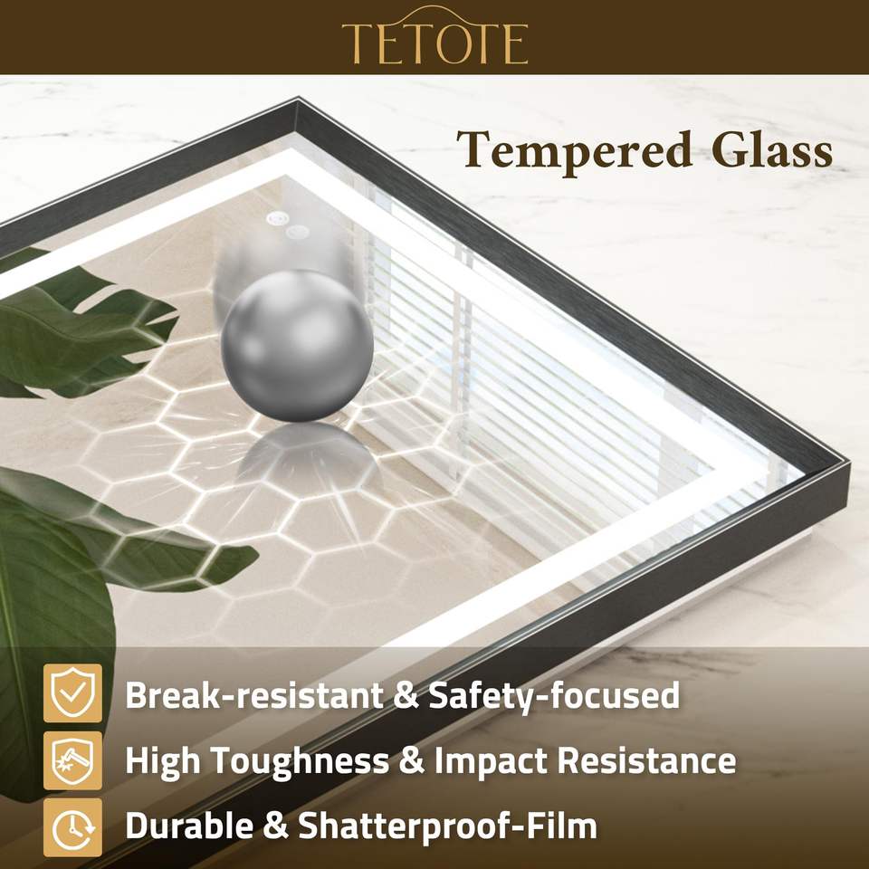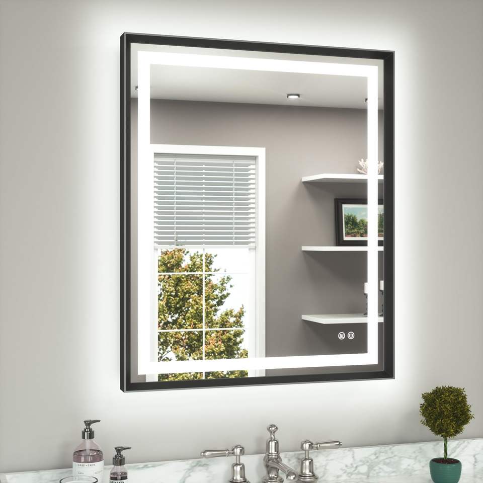 LED Mirror with a Modern Black Frame and Cool White Lights, Creates a Striking Contrast and Contemporary Vibe