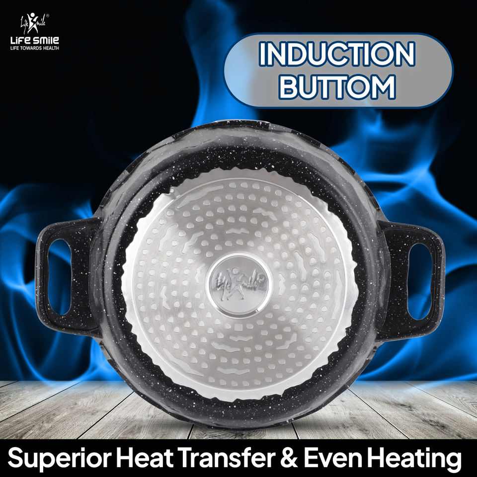 LIFE SMILE Shallow Soup & Stock Pot Non-Stick Granite Coating Multi-Layer Scratch Resistant Metal Lid Stone Design-for Cooking