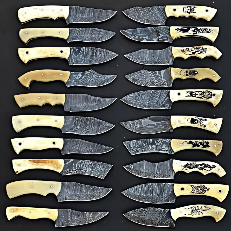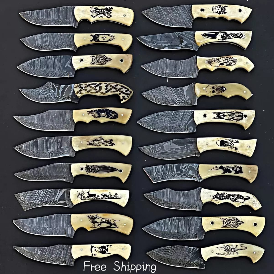 LOT 20 Pieces 8-Inch Beautiful Damascus Steel Skinner Knife Engraved Bone Handle Handmade Includes Leather Sheet OEM