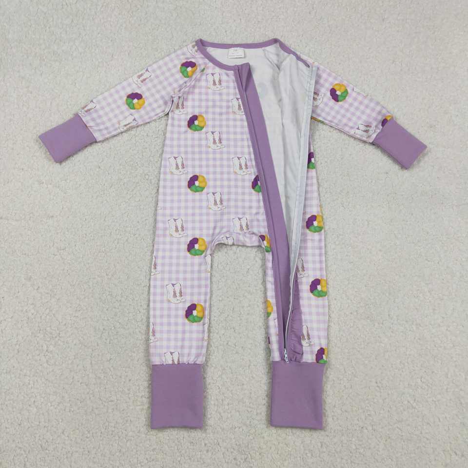 LR2783 rts Infant baby purple plaid mardi gras doughnut kids girl wholesale romper long sleeve jumpsuit child sleeper set