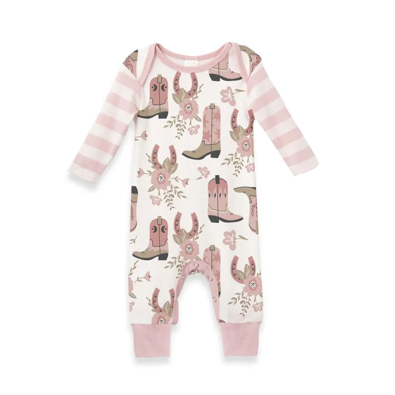 LR2976 CUSTOM Infant baby Flowers boots print kids wholesale romper long sleeve jumpsuit girl bubble