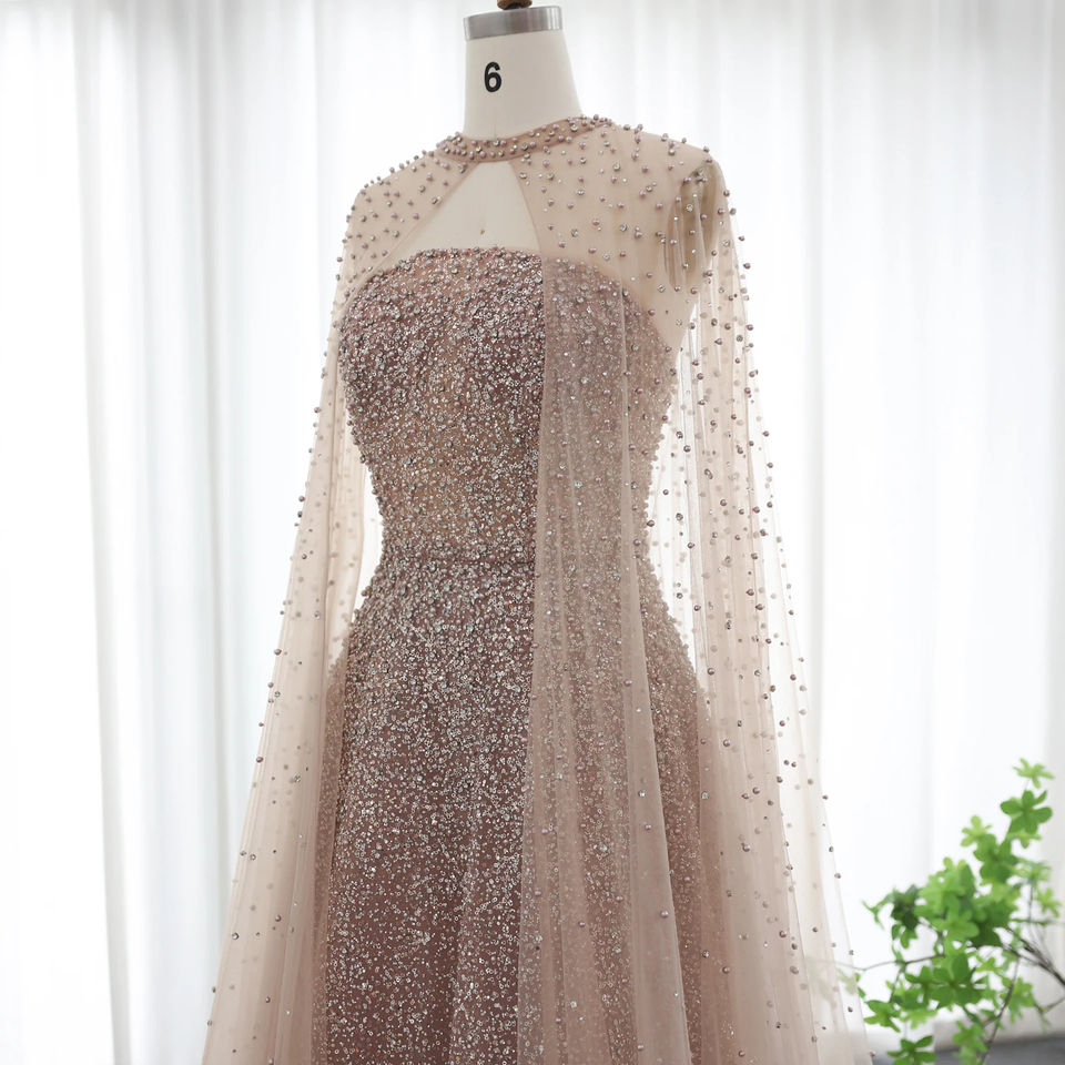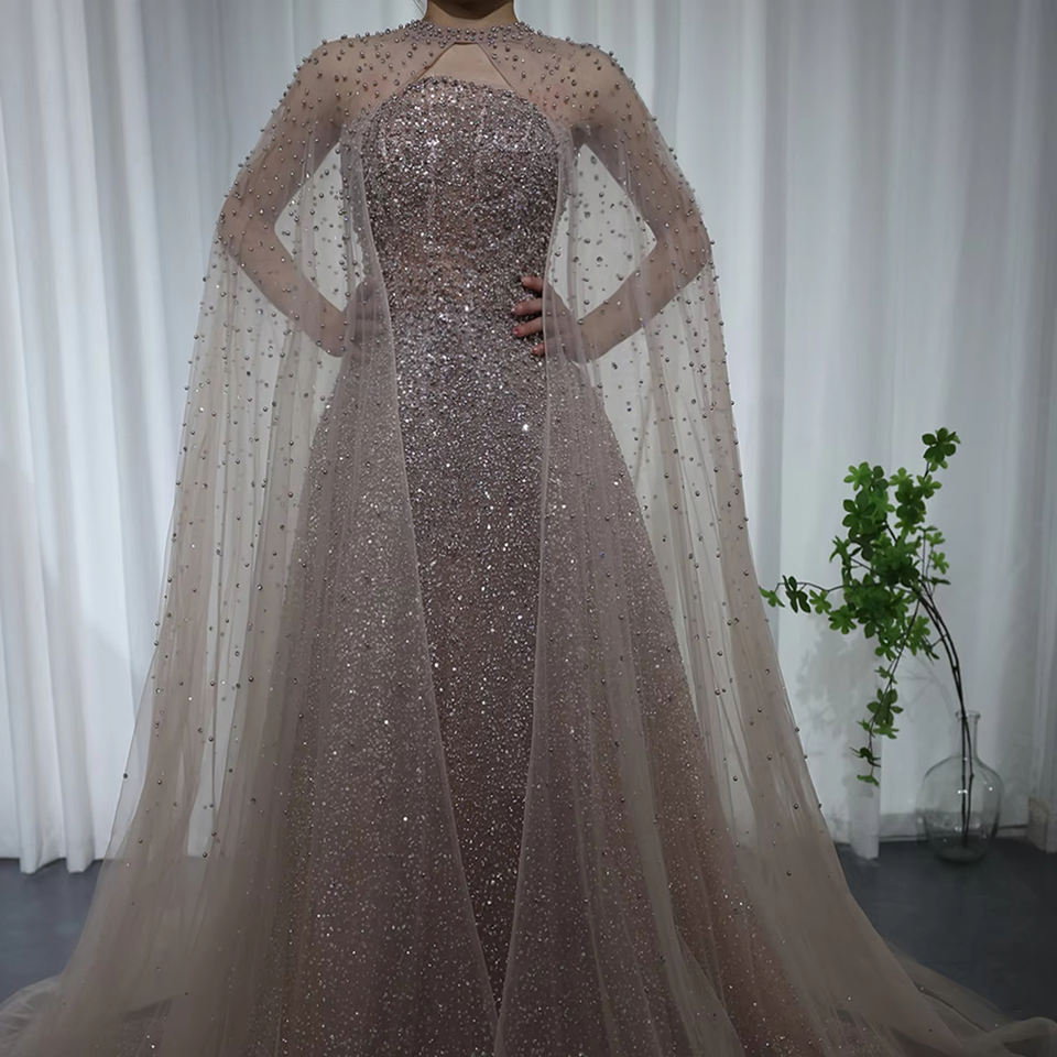 LSZ198 Arabic 3D Pattern Crystal Feathers Pleat Zipper Strapless Breathable Natural Waist Evening Party Shawl Dresses