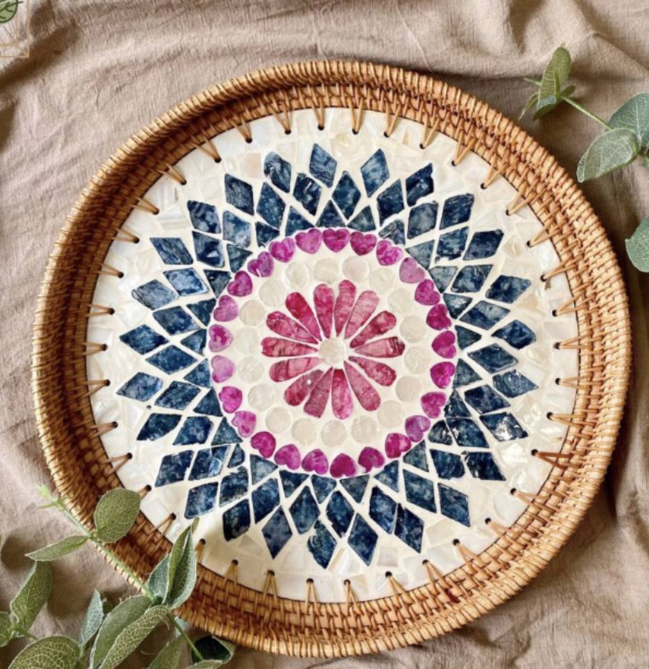 LUXURY RATTAN PICNIC BASKET WITH SHELL INLAY - HANDMADE RECTANGULAR SERVING TRAY FOR HIGH-END HOME DECOR