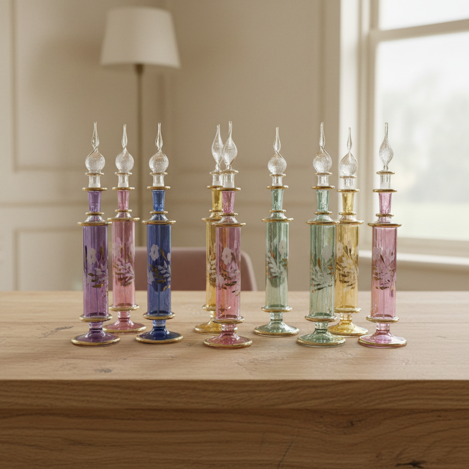 ZAHEREEN LW114 Hand-Blown Egyptian Glass Perfume Bottle 35 ML Tall Cylindrical Vial Hand-Etched Floral Design Premium Glass