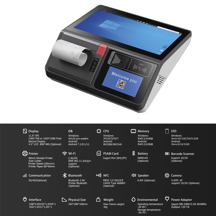 LX116 15 Inch HD POS System with 4.3 Inch 2nd Display NFC Card Reader Touch Screen Bluetooth Windows/Android Hotels Use
