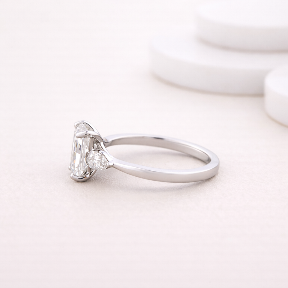 Lab Grown Radiant Cut Diamond Three-Stone Ring with Pear Side Stones in 9K White / Rose / Yellow Gold | Custom Fine Jewelry