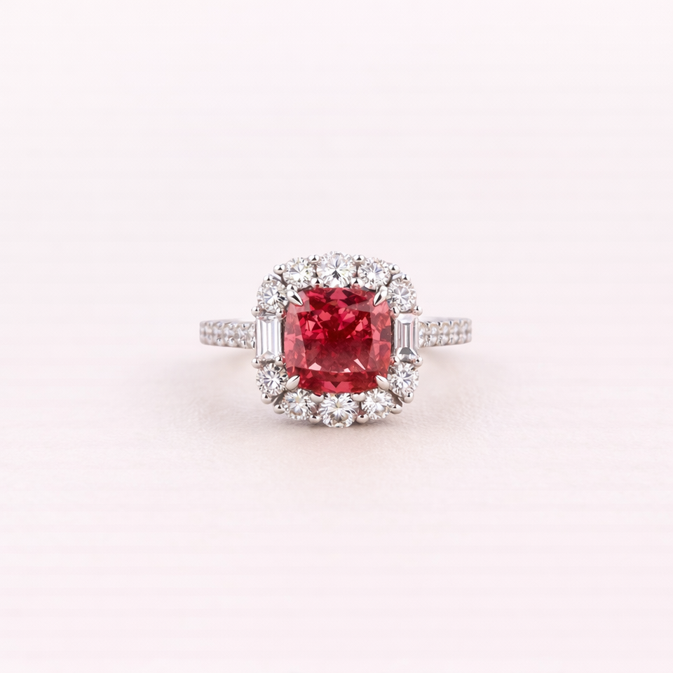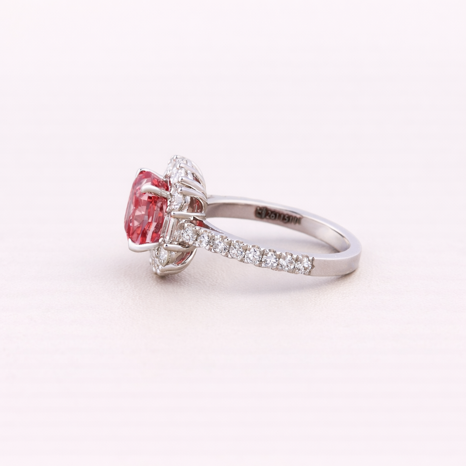Lab Grown Red Cushion Cut Diamond Halo Ring with Pavé Band in 925 Sterling Sliver | Custom Fine Jewelry