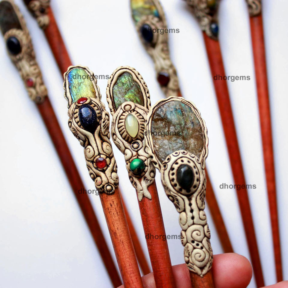 Labradorite Druzy Natural Wood Hair Finish Stick Polymer Clay Slices Crystal Stick Witch Wand Stone Hair Women Accessories