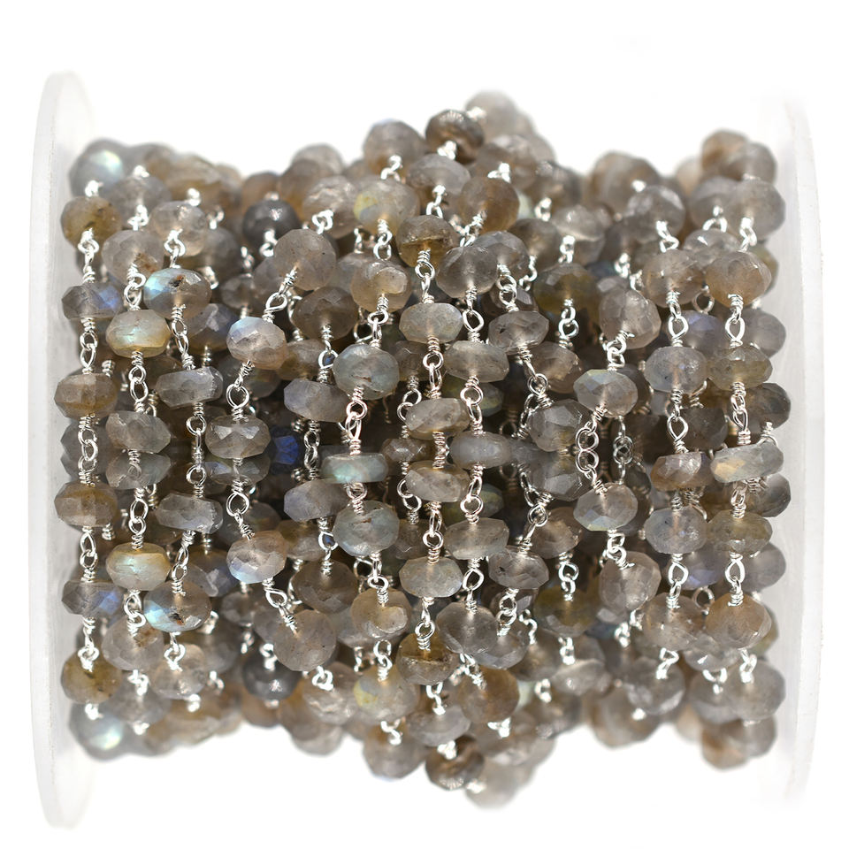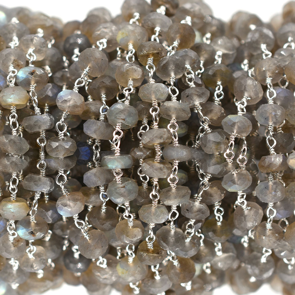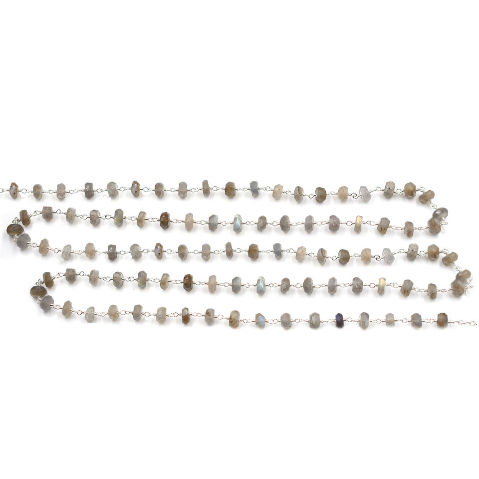 Labradorite Faceted Rondelle Rosary Chain 6–7mm Brass Rhodium Plated Wire Wrapped Gemstone Chain Sold by Foot