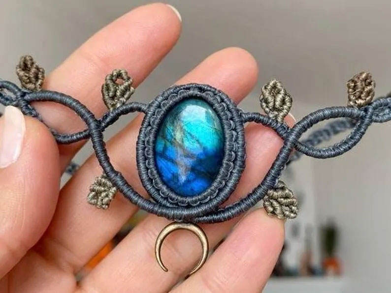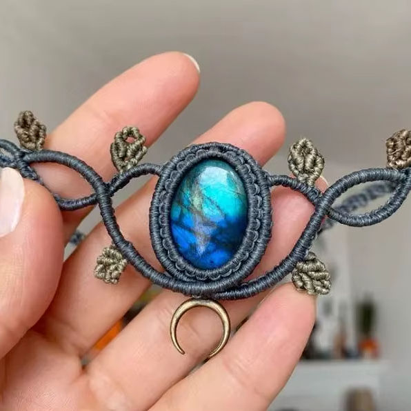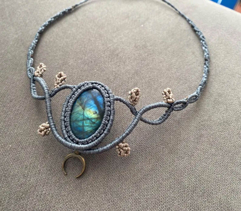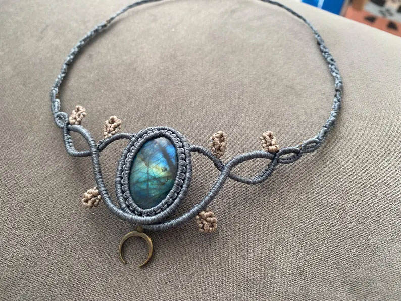 Labradorite Macrame Necklace Blue Flash Oval Gem Gray Cord Moon Charm Boho Handmade Statement Jewelry