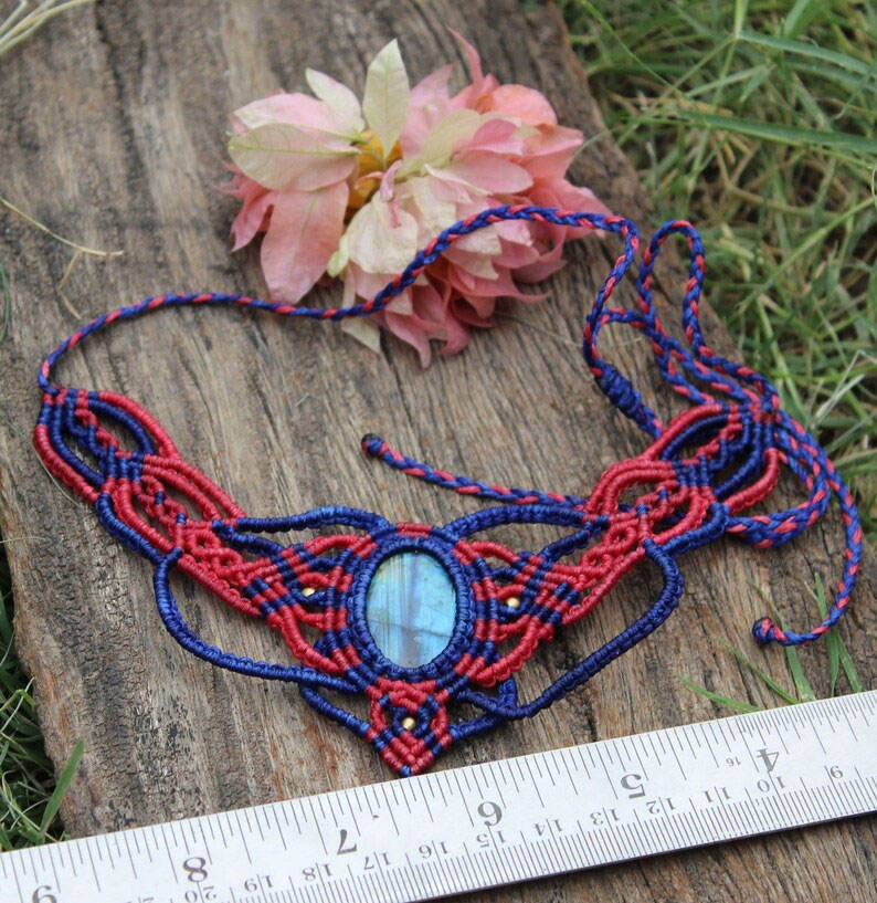 Labradorite Macrame Necklace Red Blue Thread Oval Gem Boho Handmade Statement Jewelry for Women