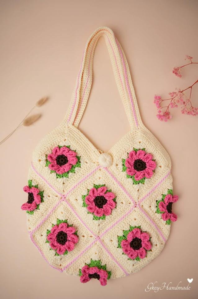 Ladies Cute Flower Jacquard Travel Woolen Woven Shopping Handbag Multiple Colors Mesh Knitting Beach Tote Bag