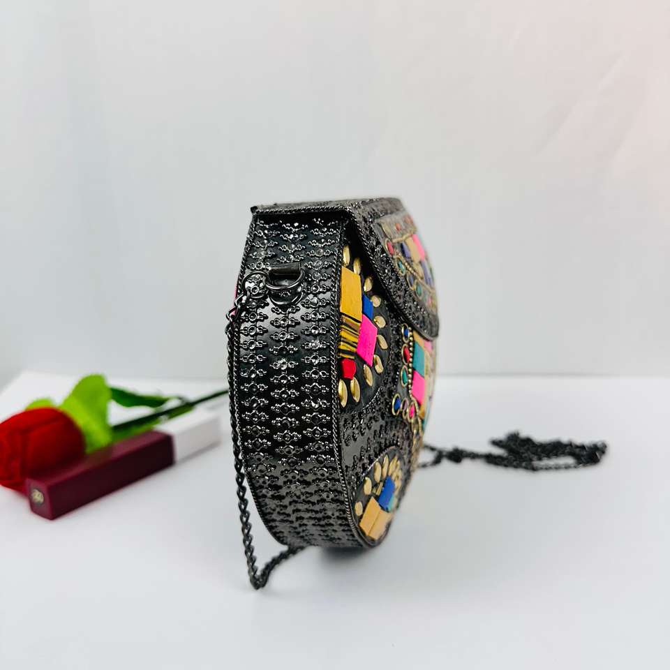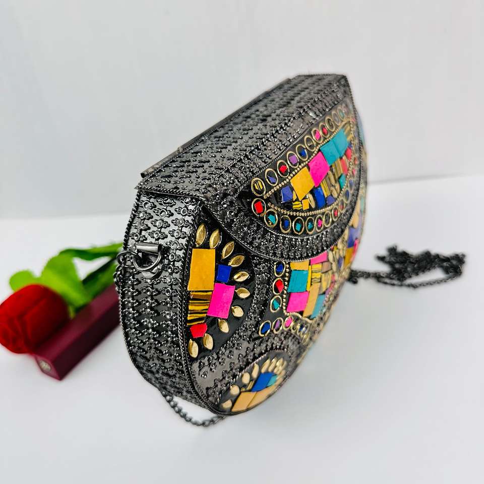 Ladies Evening Clutch Bags Mosaic Indian Design Multicolor Modern Antique Gold-Plated Polished Sculpture Style Metal Crafts