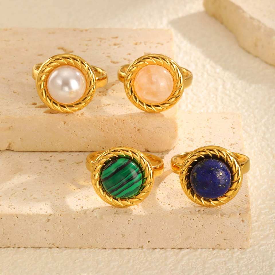Ladies Retro Style Stainless Steel Gold Twill Round Lapis Lazuli Open Ring Trendy Niche Design