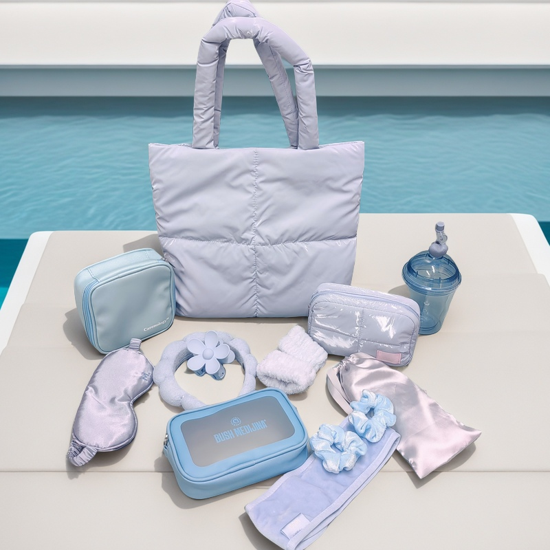 Lady Like 18 inches Totes With Travel Bags Blue PVC PU Leather Cosmetic Bags With Headband Hat Beach Neccessary For Summer