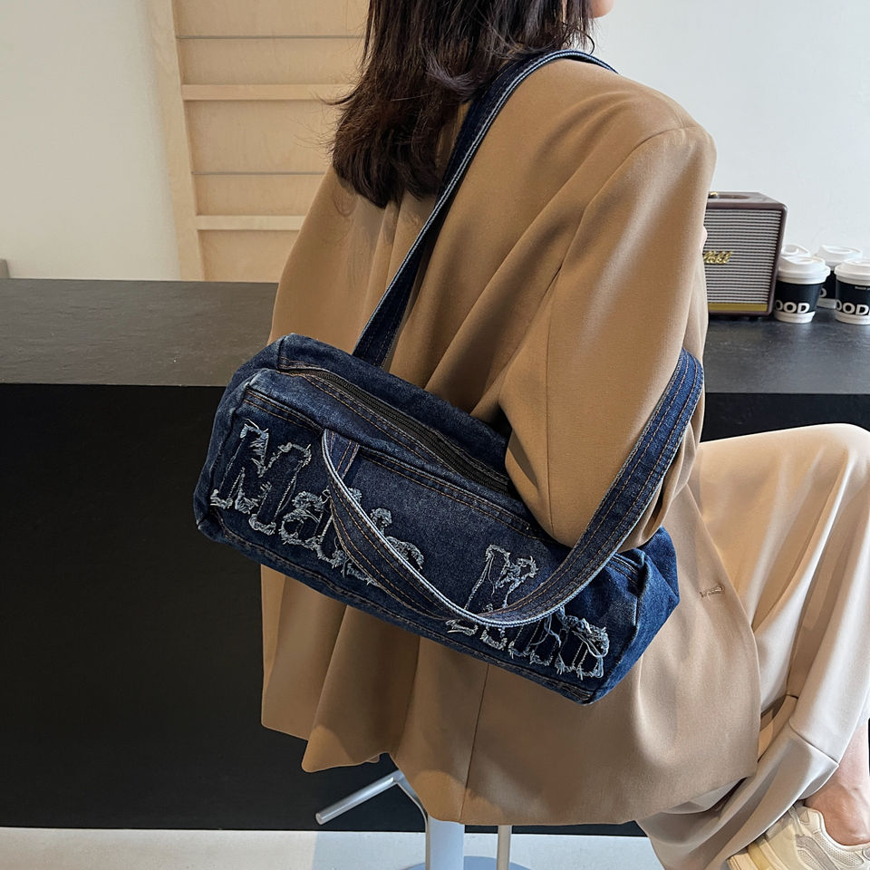 Lady's Fashionable Bowling Bag Letter Decoration High Quality Large Capacity Denim Shoulder Pillow Bag Portable for Spring