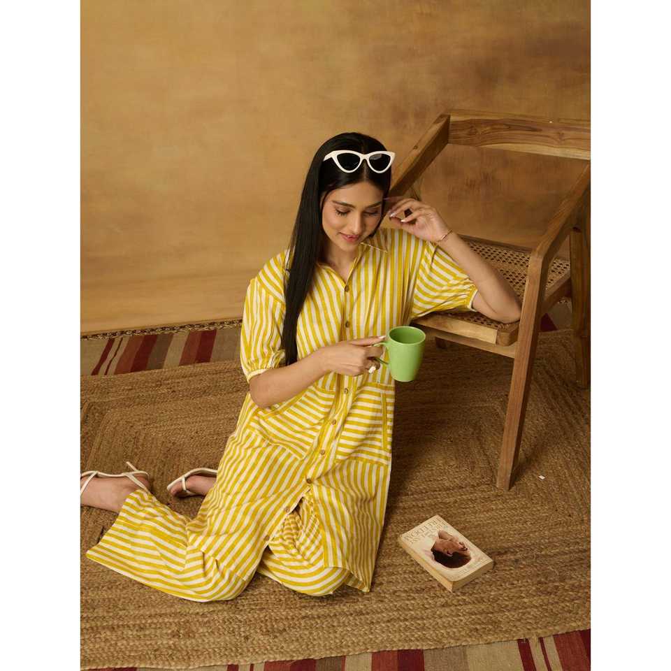 Lady's Linen Lemon Stripe Coord Set Loose Fit Summer Two-Piece with Short Tops and Above Knee Trousers Size XXS MOQ 3 Pieces
