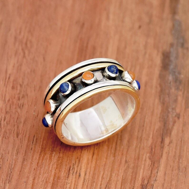 Lapis Lazuli Carnelian Ring 925 Sterling Silver Multi Stone Spinner Meditation Two Tone Gift Ring for Women