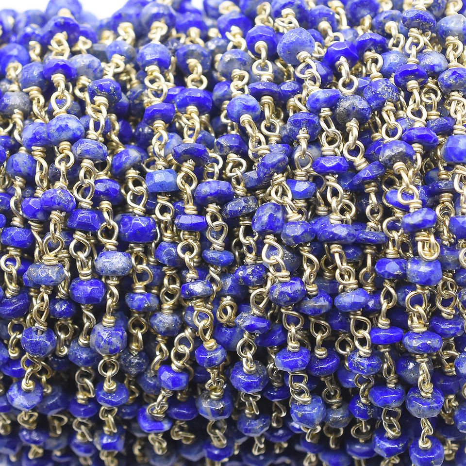 Lapis Lazuli Rondelle Shape Faceted Crystal Beads 10mm Gold Plated Rosary Wire Wrap Chain with Sterling Silver Jewelry Making