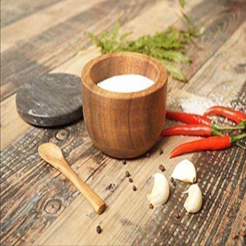 Large Acacia Wood Seasonings Condiments Pinch Salt Bowl Spice with Black Marble Lid