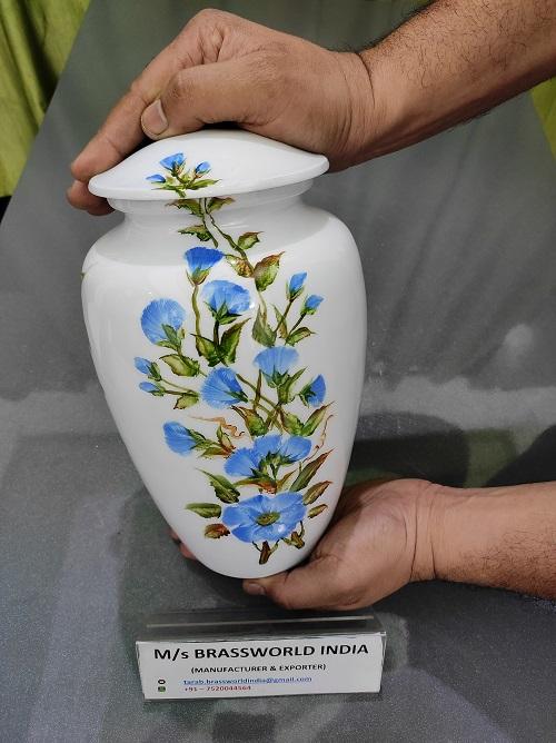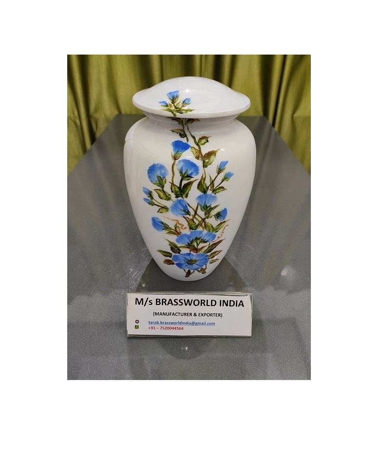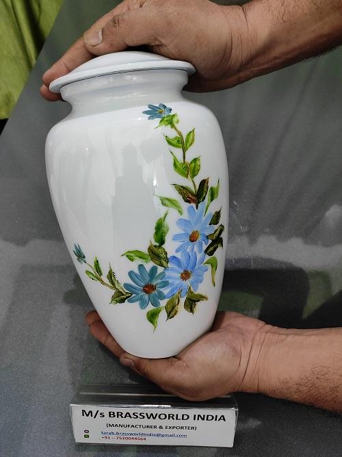 Large Aluminum Urn Container Hand Painted White with Brassworld India Logo Funeral Supplies for Men and Women