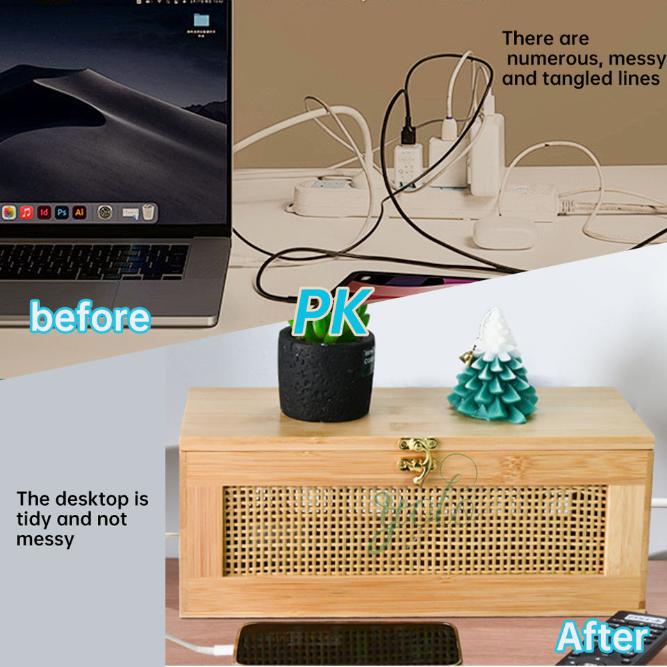 Large Bamboo Cable Management Box Desktop & Drawer Organizer Lid for Power Strips Cord Hider Wires Office/Home Storage Solution