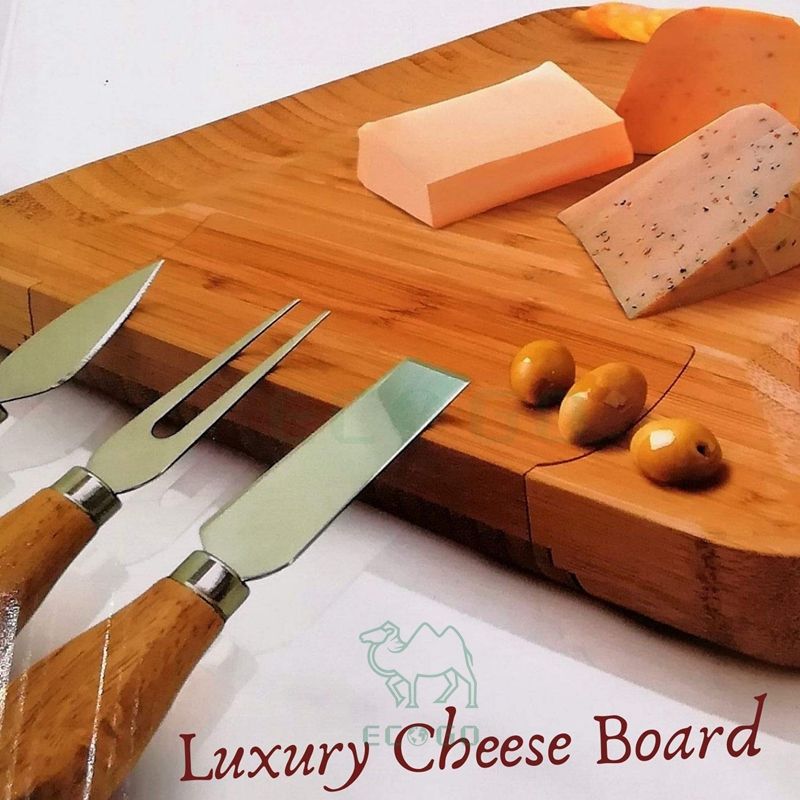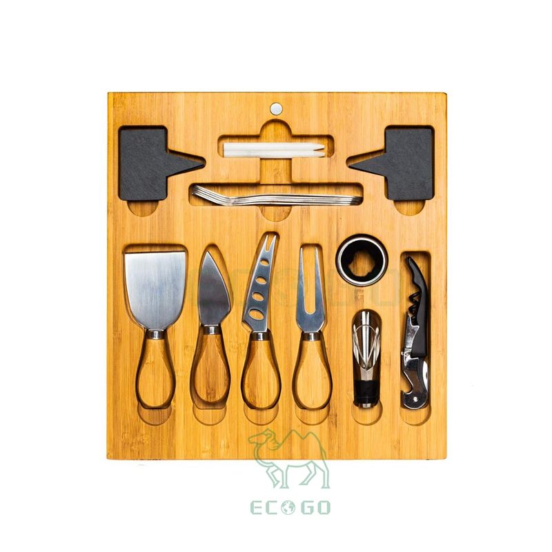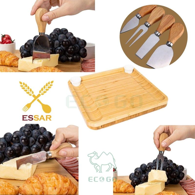 Large Bamboo Cheese Board Set Wooden Serving Tray and Charcuterie Platter with Two Ceramic Bowls Hidden Drawer&Accessories