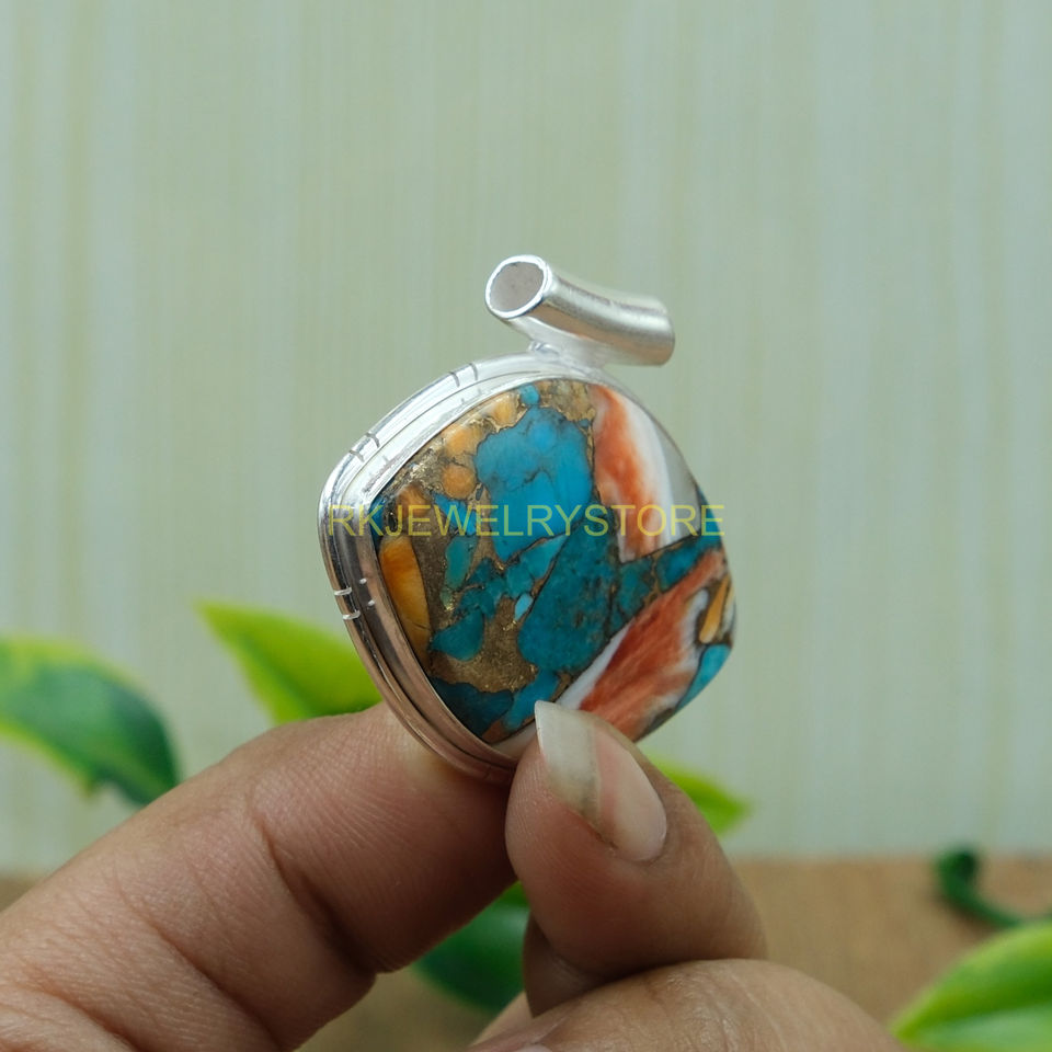 Large Blue Orange Oyster Copper Turquoise Pendant 925 Sterling Silver Handmade Statement Pendant Necklace Gift Jewelry For Men