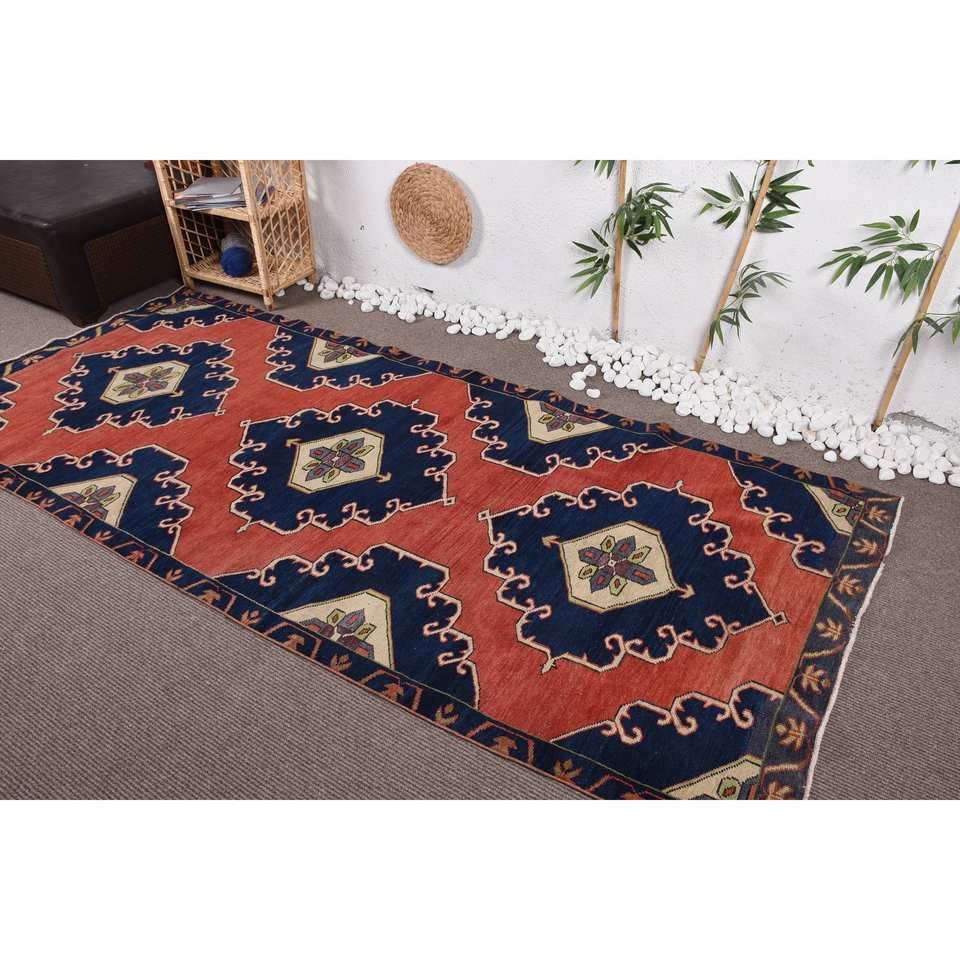 Large Bohemian Vintage Turkish Rug 4 X 9.3ft Red Black Patchwork Design Wool Material Latex Abstract Rectangle Hallway Room Rug