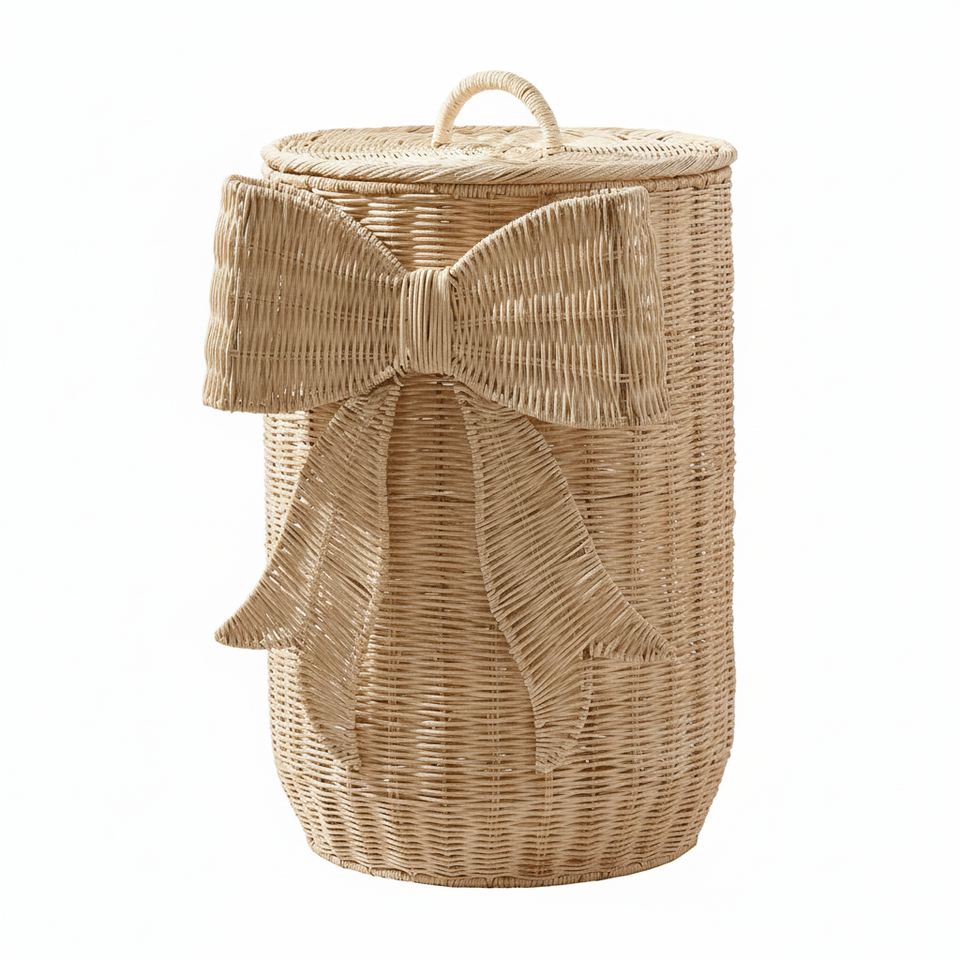 Large Bow Shaped Laundry Hamper Premium Woven Rattan Wicker, Handmade Clothes Basket with Lid