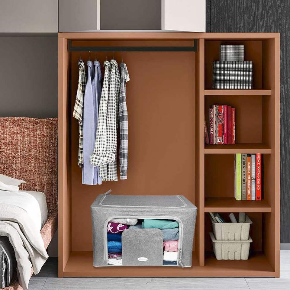 Large Capacity 2 Grey Fabric Wardrobe Organizer Boxes 50x40x33 Cm-66 Liters with Window Metal for Clothes Storage