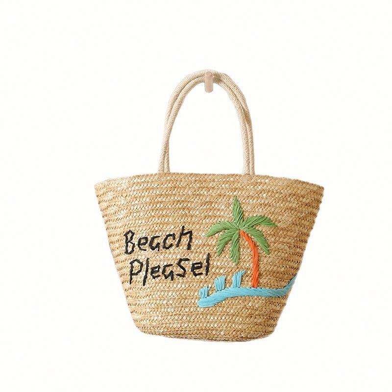 Large Capacity Coconut Tree Embroidered Portable Straw Bag Open Closure New Letters Holiday Style Beach Bag