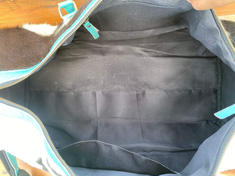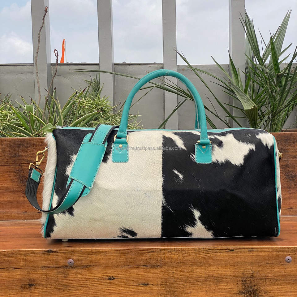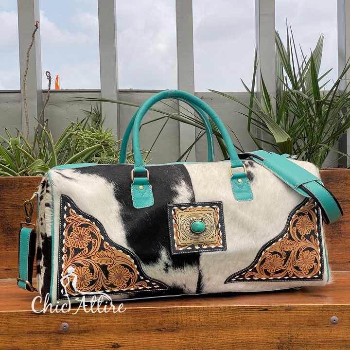 Large Capacity Cowhide Fur Leather Duffel Bag Luxury Turquoise Stone Business Hand Tooled Travel Lightweight Durable Weekend Use