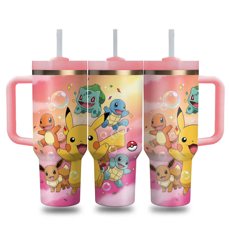 Large Capacity Cute Cartoon Pokemoned Pattern Insulated Tumbler 304 Stainless Steel Outdoor Travel Mug with Handle and Straw
