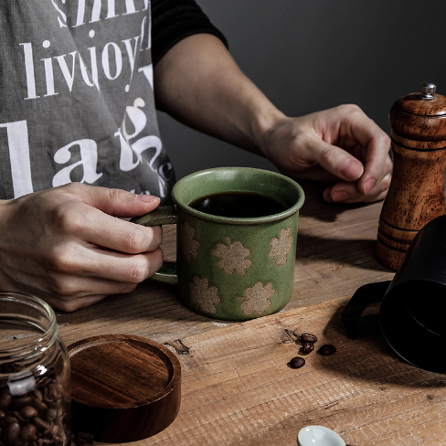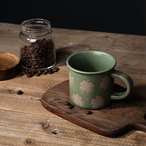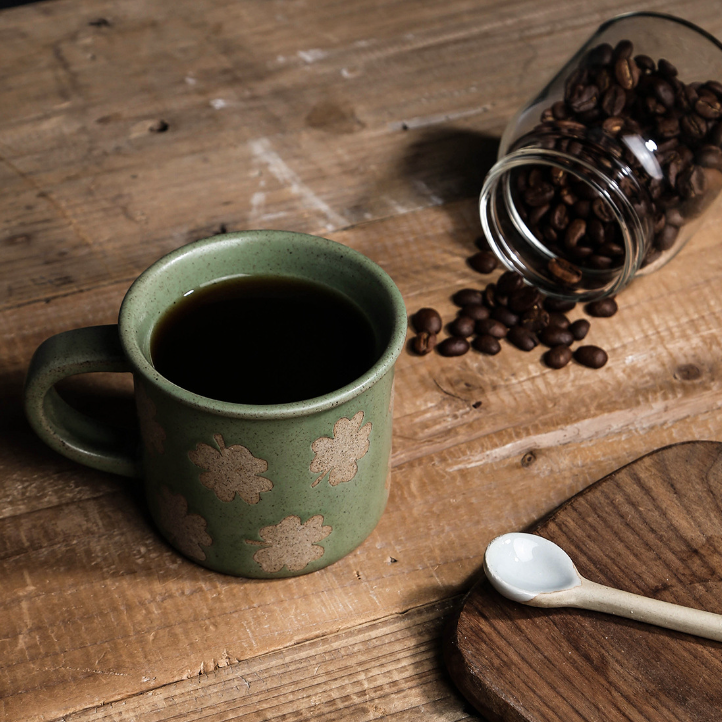Large Capacity Fall Retro Modern Green Porcelain Four Leaf Clover Mug Sesame Glaze Dishwasher & Microwave Safe