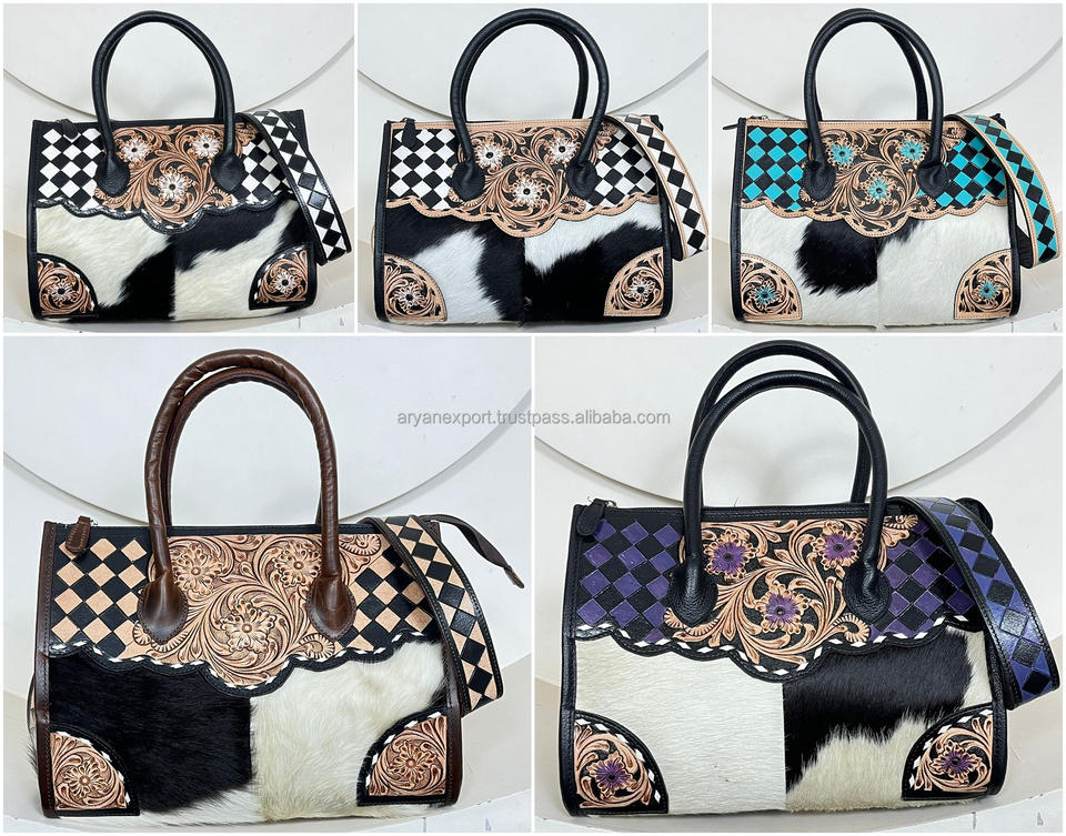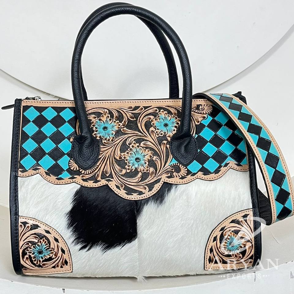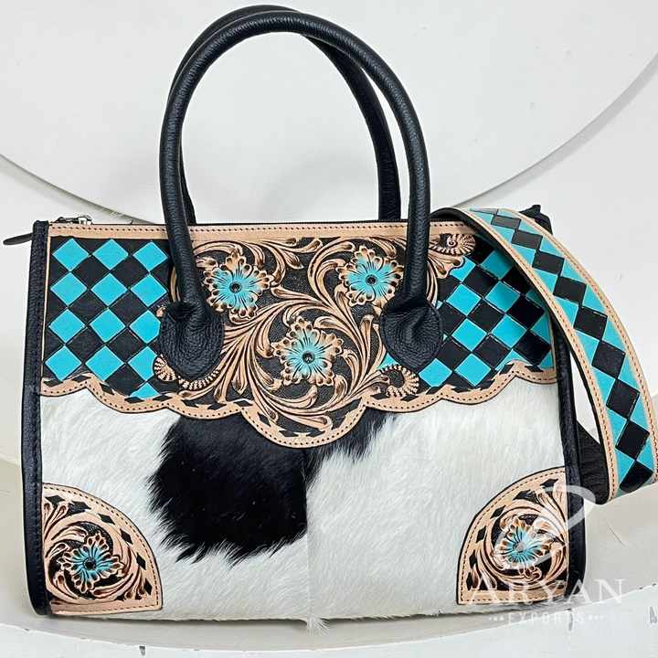 Product Name:Hand Tooled Checkered Leather Crossbody Tote Bag