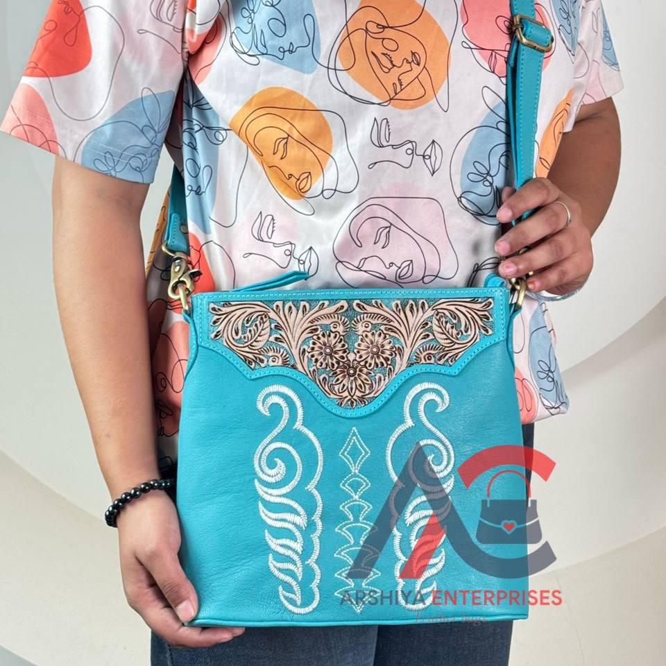Hand Tooled Leather Boot Stitch Crossbody Bag