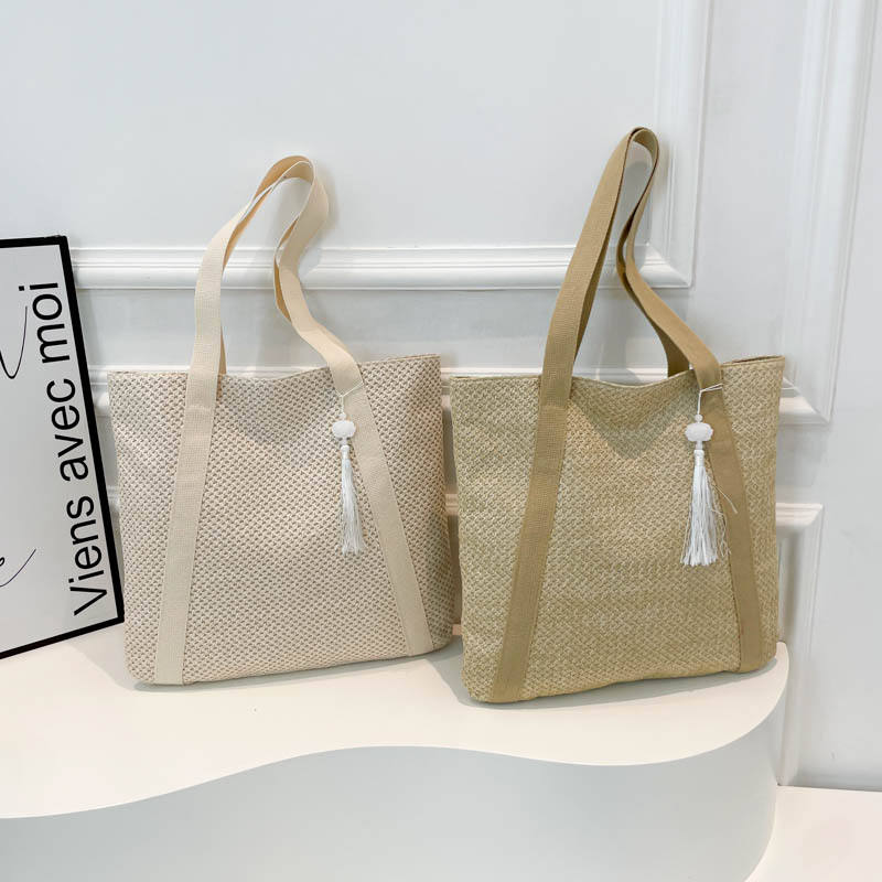 Large Capacity Trendy Vintage Summer Autumn Bohemian Two Straps Waterproof Handbag Women Solid Color Straw Weave Shoulder Bag