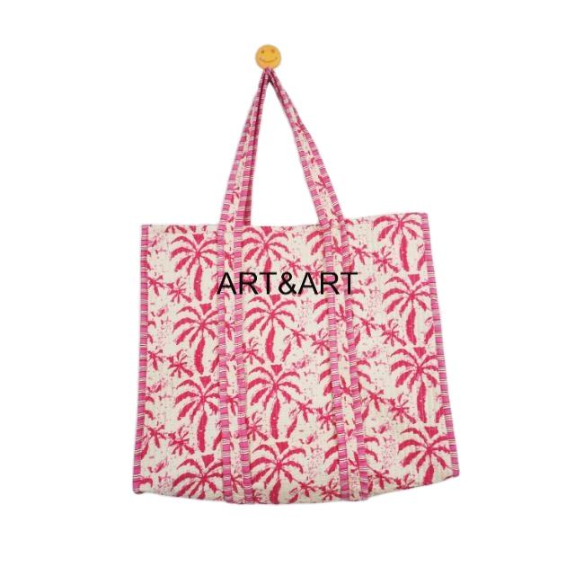Large Cotton Quilted Tote Bag Beautiful Pink Palm Tree Print Colorful Shoulder Duffle Bag Open Top Handle Stylish Lady's Travel