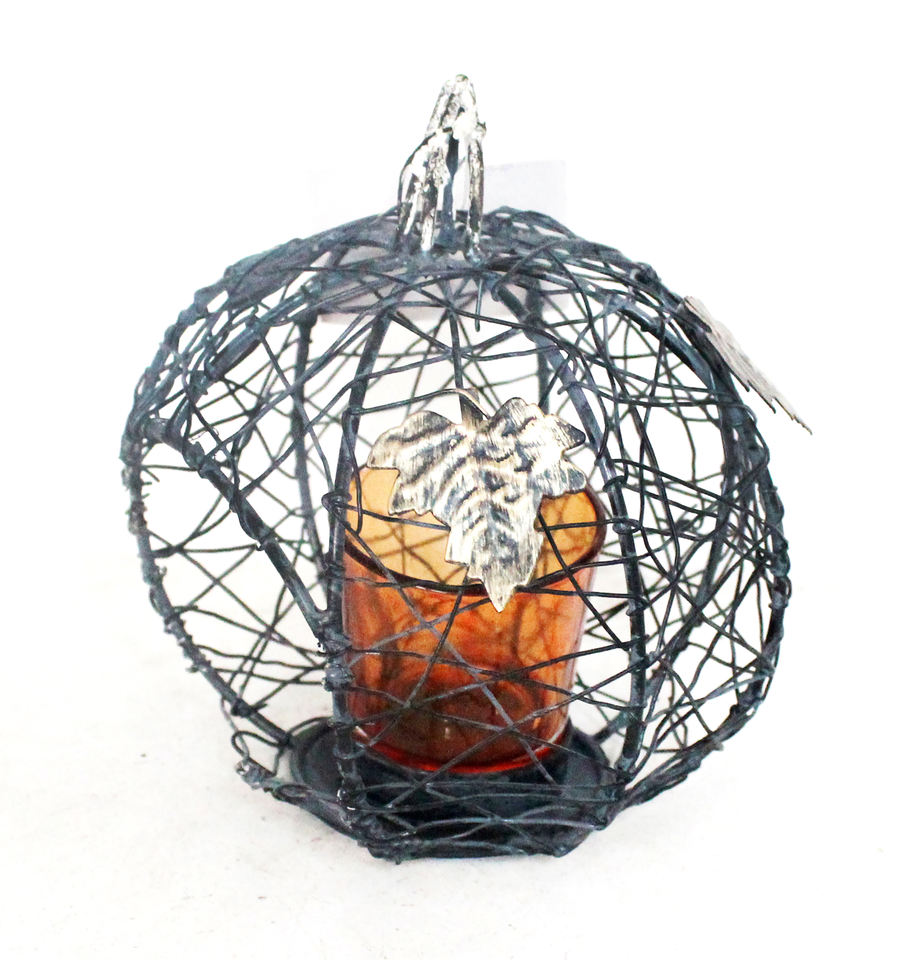 Large Decorative Wire Pumpkin Candle Holder with Rustic Metal Leaf Accent and Glass Cup for Autumn Fall Festival Home Decoration