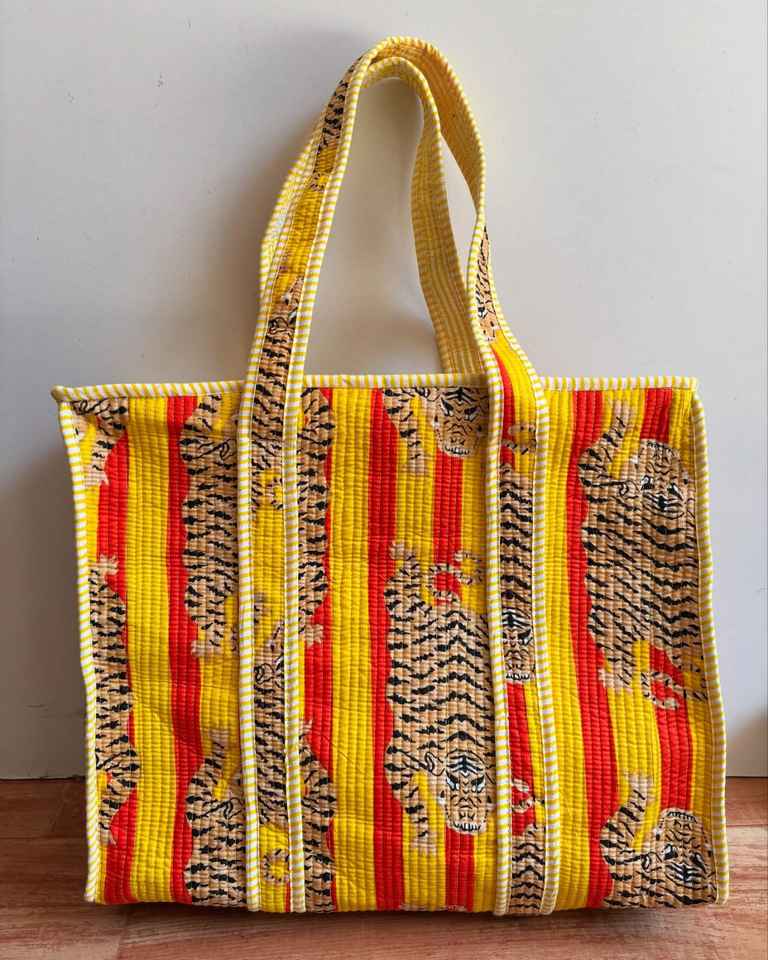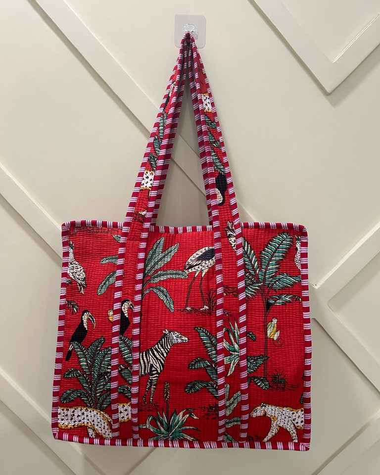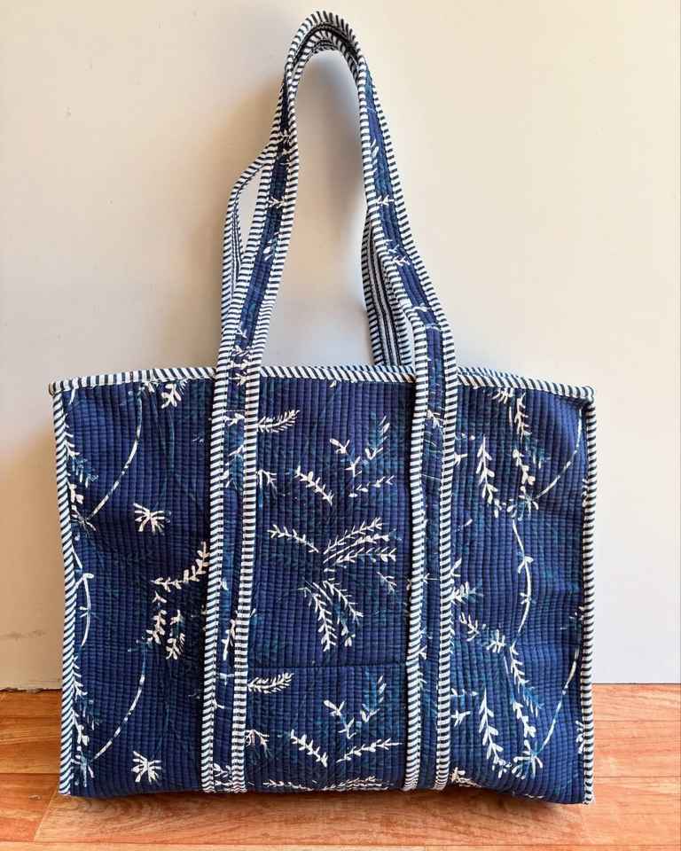 Large Floral Quilted Cotton Tote Bag for Women Bohemian Block Printed Zipper Drawstring for Daily Wear Spring Summer Storage