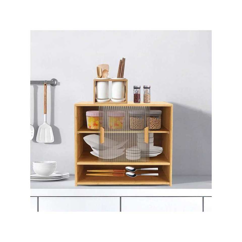 Large Freestanding Countertop Storage Cabinet Spice 2 Sliding Striped Glass Doors Bamboo Kitchen Pantry Sideboard